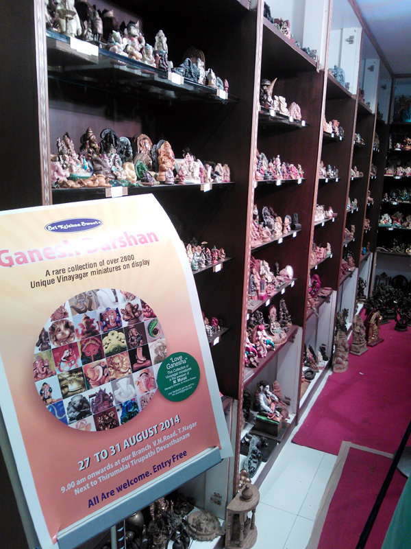The Managing Director of Sri Krishna Sweets (SKS), M. Murali recently revealed another passion of his apart from running his sweet shop. He loves collecting Vinayagar images, idols and statues and he has put up a display of his collection of over 2600 statues at the Sri Krishna Sweets branch on Venkatnarayana Road, T.Nagar. It’s being held from Aug. 27 to 31, 2014. The display is open from 9 a.m. onwards.