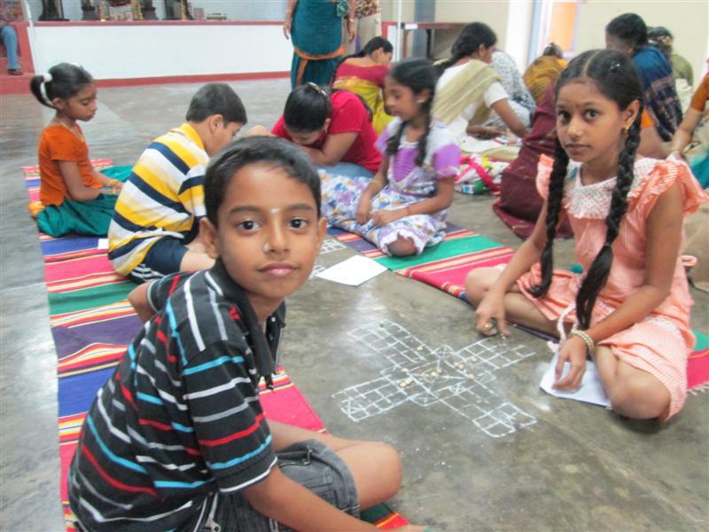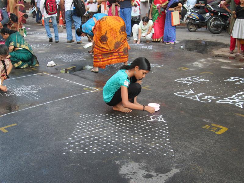 Children took part gamely in the kolam contest along with senior men and women.