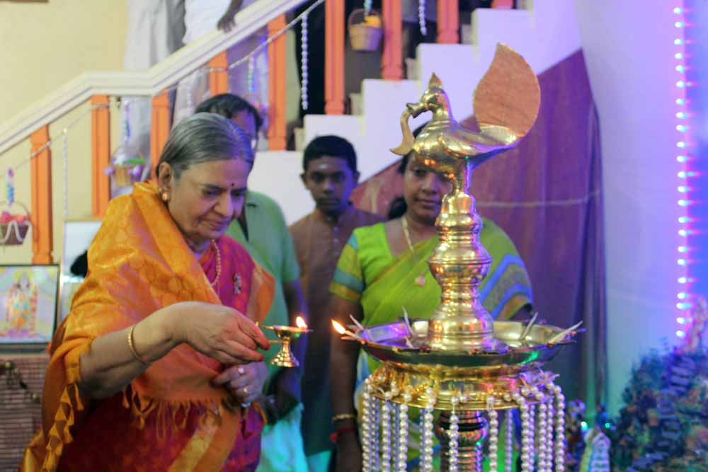The devotees of Nandala Temple were enthusiastically waiting for the Navarathri golu inaugural ceremony on Sep. 25, 2014. They invited the Chief Guest Mrs. Vanathi Srinivasan general secretary of BJP and a senior advocate in Tamil Nadu, and the founder of Nanadala Trust Pujya Sri Mathioli R. Saraswathi. The song sung by Kalyani Srinivasan made the audience feel as the heaven’s mother enters the temple.