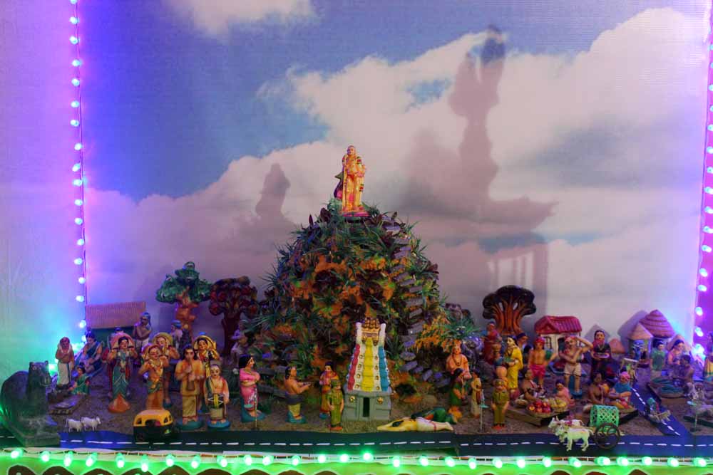 Mrs. Vanathi Srinivasan inaugurated the ceremony. Everyone entered the hall where the kolu was placed. Crafts and art made by the students welcomed us in the entrance. The journey begins as we were in the Palani temple, Kailash, and the nine steps of beautiful statues bring life to the hall. In the center of the hall, images of Abirami battar, Thirugnanasambanthar, Kalidasar, Seetha Devi with a sand Lingam, Lord Parvathi with Turmeric Ganesha, Annapoorani providing food for Lord Siva, Parvathi holding Siva’s throat to prevent the poison and giving sakthi vel to Lord Muruga were placed in octagon shape.