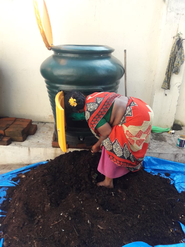 Radhika Subramanian, who did her masters in agriculture, is a passionate environmentalist and plant-lover. She has been composting since 2015 as a hobby and still does. But after the 2016 floods, she realized that her doing composting alone would not be sufficient, and started giving awareness programs in and around her area, including Stella Maris college, Harishree Vidyalayam, Chettinad Vidyashram, and even some corporate companies. In the same year, she got associated with ‘Daily Dump’, an organization based in Bangalore, which sells mainly composting products. She bought their products and realized that it simplified composting to a great extent. In the beginning, of all the people she met, only a few of them actually started composting. But now, four years later, she looks back and says, “I can feel a real change. I am getting more and more queries from people nowadays.”